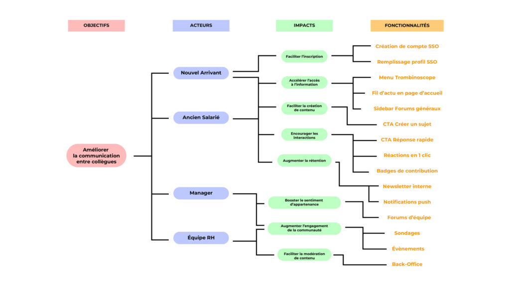 Une entreprise telle que Groupomania rassemble des profils très variés. Il était important de considérer l’utilisation et l’impact d’un tel réseau sur toutes ces catégories d’utilisateurs, grâce à un impact mapping et aux user flows pour chaque persona.