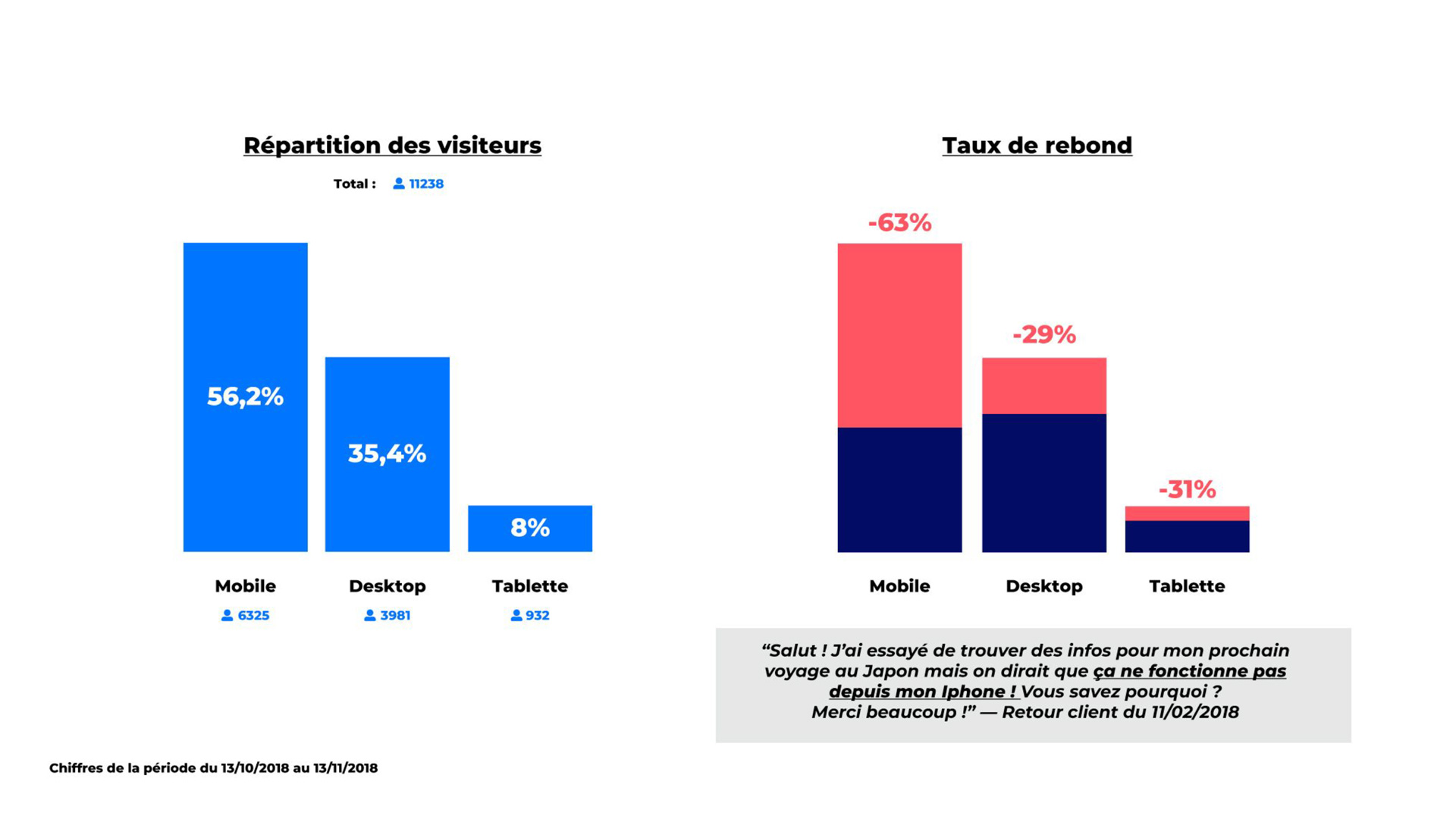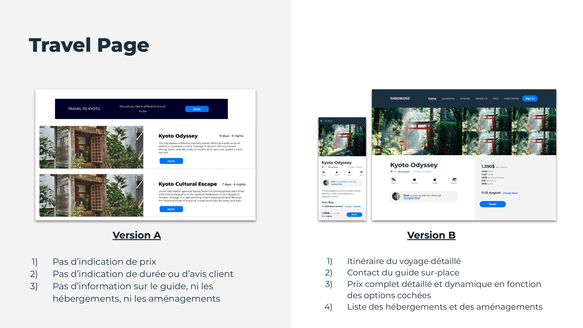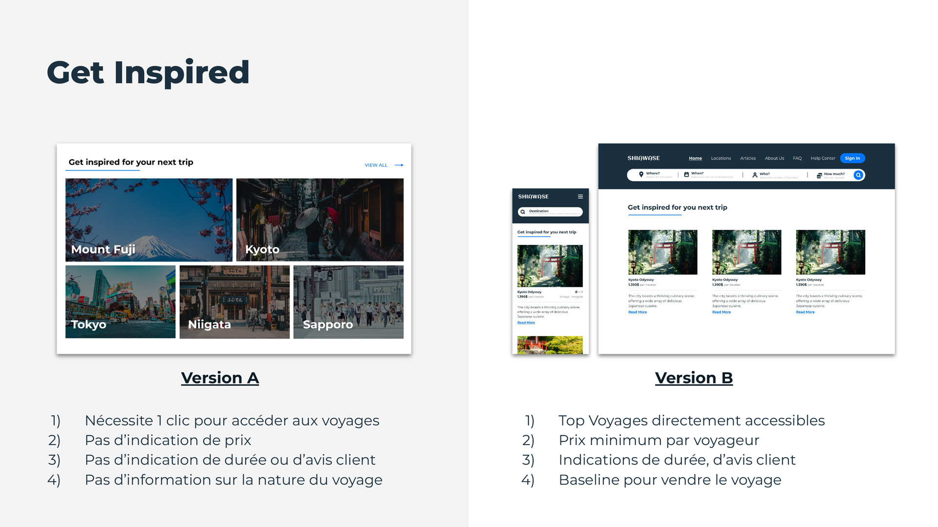 Shiawase est une entreprise spécialisée dans l’organisation de voyages au Japon. L’objectif de ce projet était d’identifier les zones de la home page à retravailler afin de booster le taux de conversion du site. Pour m’aider dans mon analyse, j’avais à ma disposition :