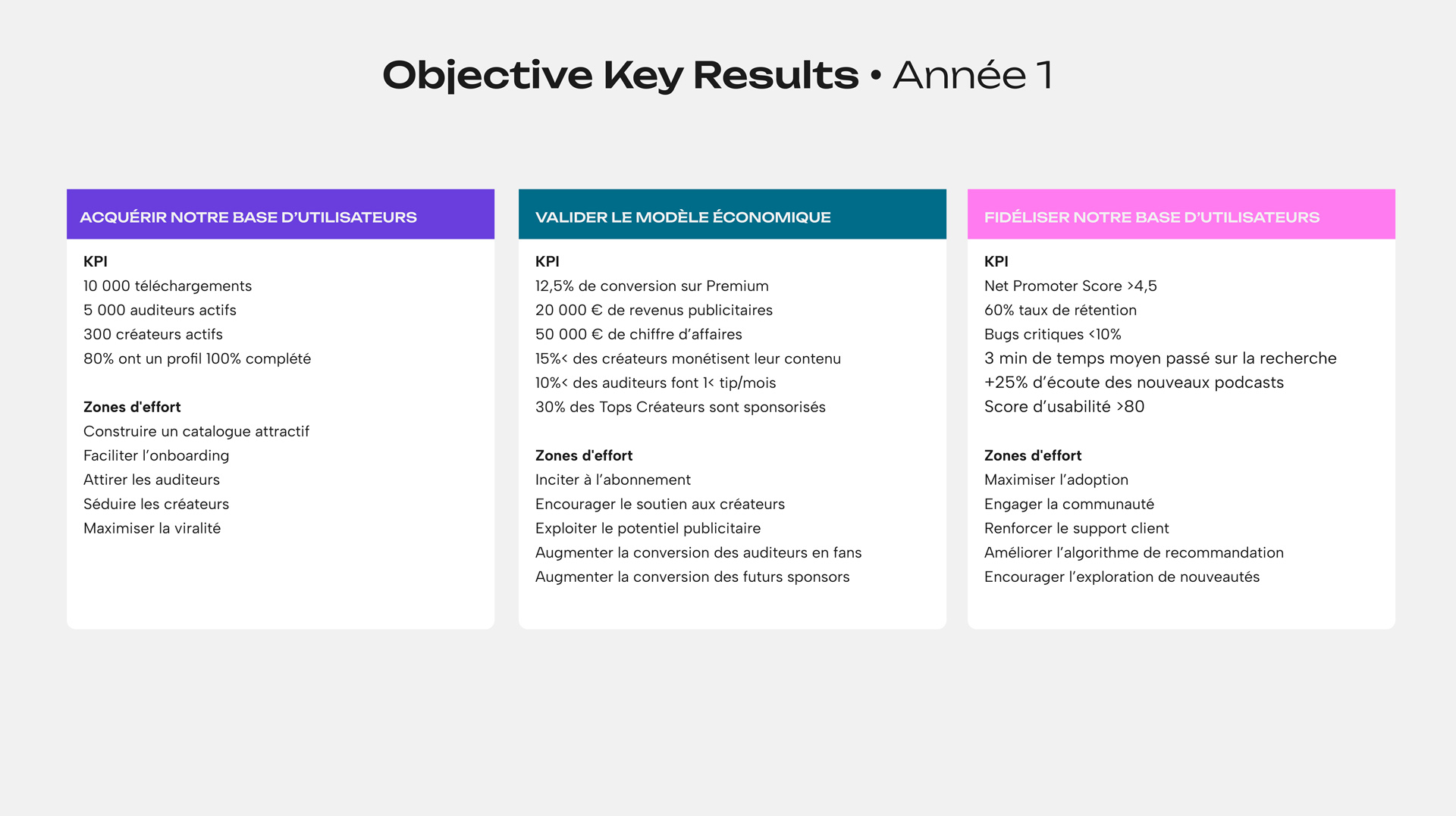 Une roadmap a ensuite été élaborée sur 3 mois, 3 trimestres et 3 ans afin d’organiser par ordre de priorité les zones d’effort sur lesquelles nous allons travailler, au regard de l’atteinte de nos OKR mais aussi de la valeur qu’apporte notre produit aux utilisateurs.