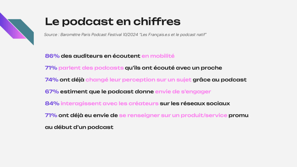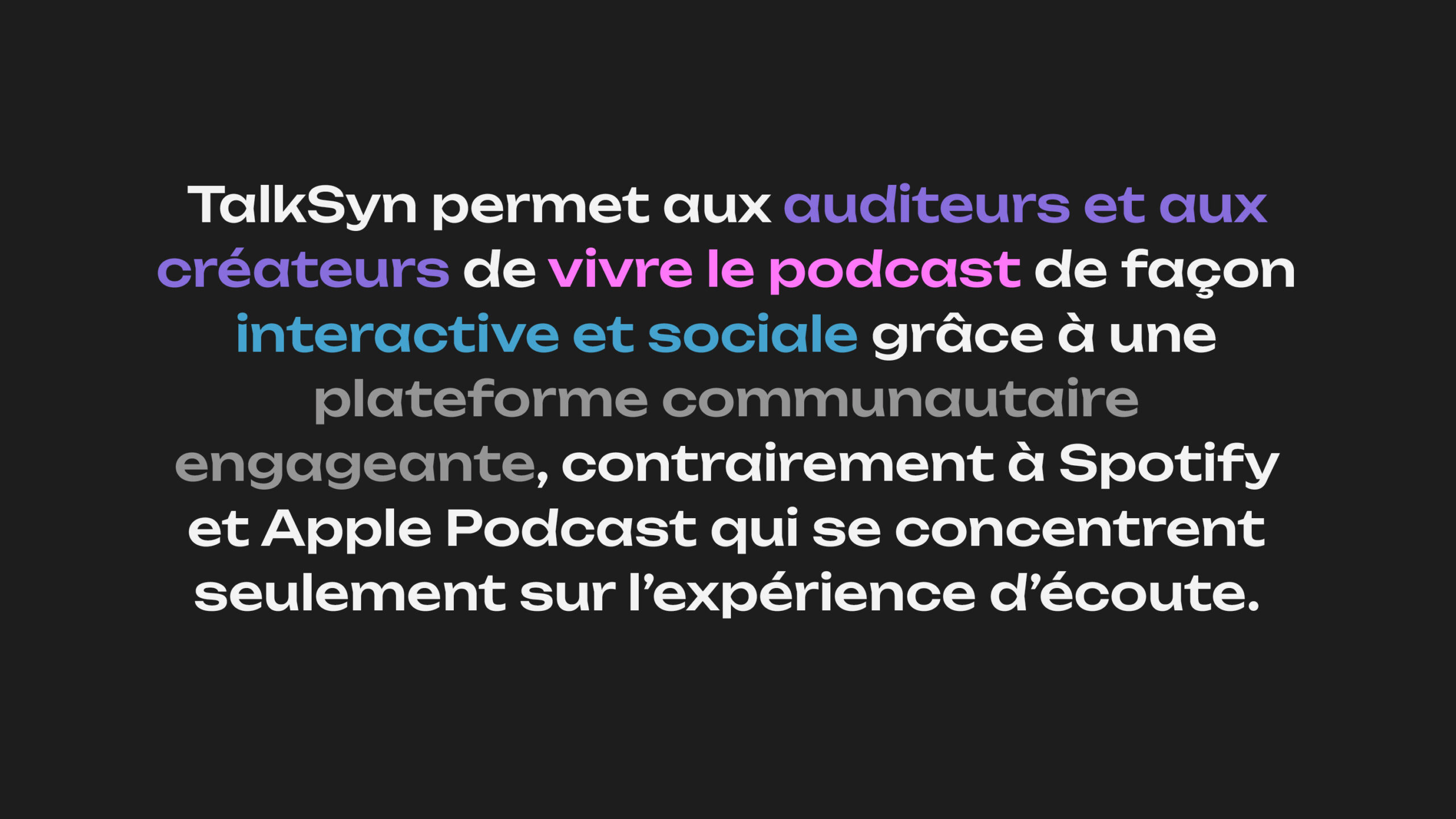L’idée de Talksyn est née d’un constat simple : le podcast est un format en pleine expansion, mais il reste une expérience solitaire et passive. Contrairement à la vidéo ou aux réseaux sociaux, il manque d’outils interactifs pour engager les auditeurs et renforcer les liens avec les créateurs. Pourtant, le podcast est un média conversationnel engageant qui a un fort potentiel publicitaire.
