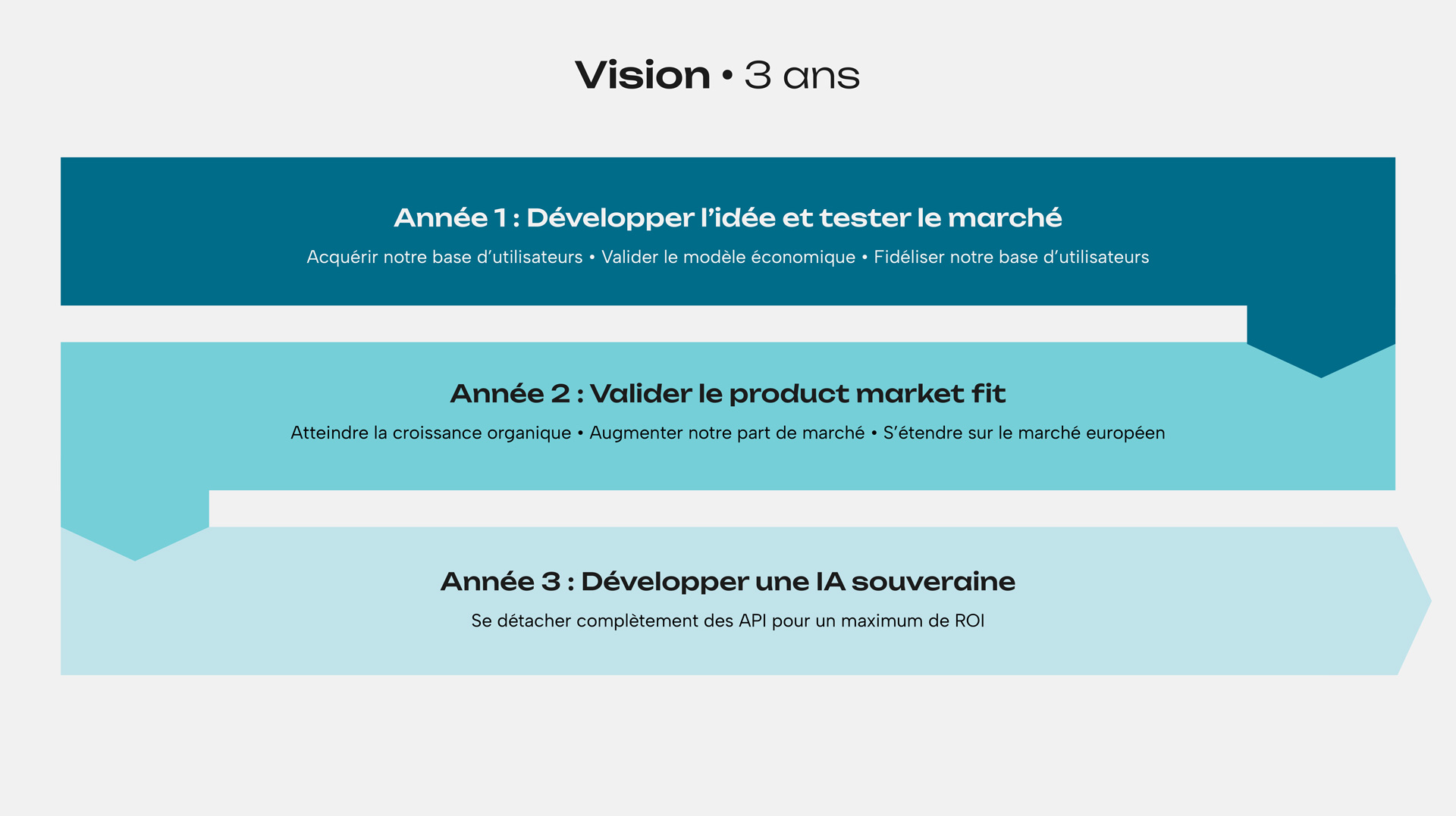 La vision sur 3 ans est assez simple : tester notre idée sur le marché la première année, consolider notre communauté dans l’espoir de valider le product market fit la deuxième année et investir pour développer un algorithme d’intelligence artificielle souverain la troisième année.